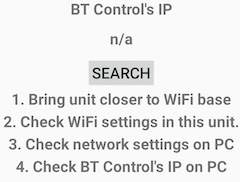HARD-CODED IP You can force the BT to connect to the control software’s IP (shown in the header of the control software’s main interface) if Search does not detect the IP. The IP is entered in the field “Enter IP manually here”.