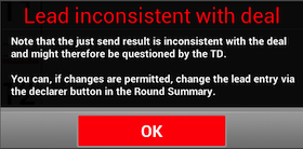 Inconsistent lead You need to check what is wrong if the inconsistent lead message is displayed. Normally the lead has been incorrectly entered but it could also be that the declarer is wrong or you do not have the correct deal in front of you.