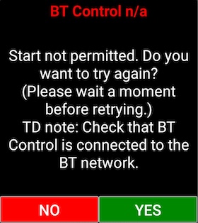 Start button The Start button will show when the WiFi icon is blue, but that is no guarantee that start is possible. It can happen that the warning of the type shown to the right will be displayed when you click the Start button. It can also happen that the WiFi icon changes from blue to another colour indicating that the communication does not work as it should. See the Network page for explanations and advice.