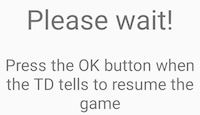 The warnings that BT presents should be self-explanatory. In the example shown below you will see the Game stopped warning if you miss that the WiFi icon has changed to grey. An OK leads to the Please wait! screen where you will have to wait until the WiFi icon reverts to green.