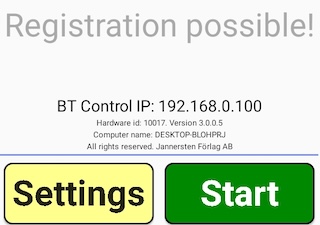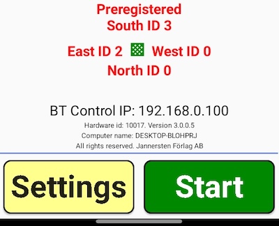 Start button appears The green START button appears when contact with the control software has been established. That does not mean that you can start playing. If the Wifi icon is grey and it says “Registration possible”, you can register the start positions. The button will lead to the Game not started message shown to the right if the game has not been started. Pre-entered IDs will appear in the mid section of the screen. If the IDs are correct, you should await the WiFi icon to become green before clicking the START button. (Otherwise you will have to pre-register anew.) You can change your player ID entry when the game has been started, were you to change start position in the last minute.