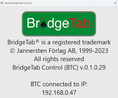The BTC menu contains information about the programs used to run BridgeTabs and some basic settings.