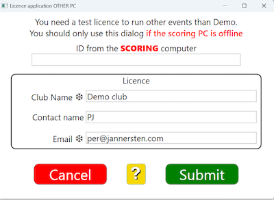 First you will have to select BUY LICENCE on the scoring computer. Byt bild Copy the scoring computer’s ID (starting /qdAT... in the example). Then paste the ID into the licence application for OTHER PC. BYT BILD Click Submit, reconfirm that the application is for another PC, and you should get an email with the licence code. Copy the code and bring it to the scoring computer. On the scoring computer you select LOAD LICENCE