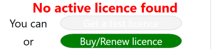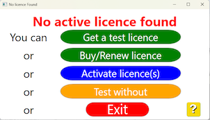 The message shown below appears when there is no active licence. The normal choice is to get a test licence, but you can purchase a licence right away or test without any licence. If you have just bought a licence, you should activate it.