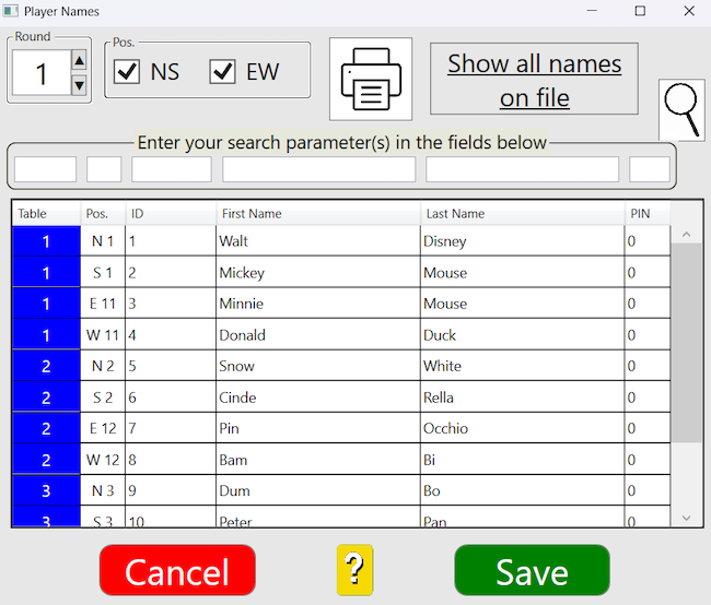 You can search for a table, a pair number, member ID, or name. Enter your search parameter(s) in the box(es) above the respective column and click the magnifying glass.