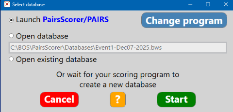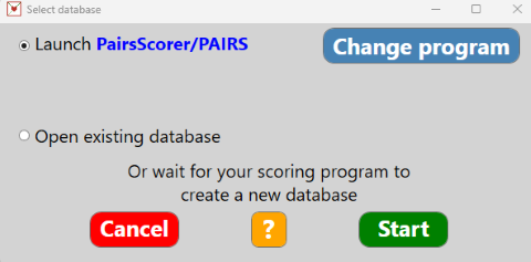 1. LAUNCH SCORING PROGRAM Launch starts the selected scoring program button (PairsScorer/PAIRS in the example). The Change program button leads to a dialog where you can accept, or change, the choice of scoring program.