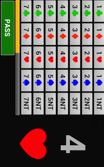 The selected bid (4 hearts in the example) is prominently displayed while the yellow bar shows the time remaining of the 2 seconds grace period. The grace period is intended for corrections of unintentional button presses. A change of a bid after the end of the grace period is recorded (and could lead to a ruling).