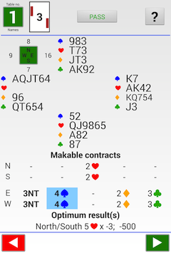 The analysis screen shows (from top to bottom): — High card count — The deal — The contracts that can be made (double dummy) — The optimum result(s) shown as: declarer final bid. The settings for how this is displayed are the same as for the players entry method.