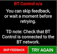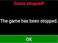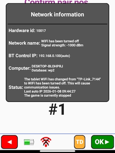 The warnings that BT presents should be self-explanatory. In the example shown below you will see the Game stopped warning if you miss that the WiFi icon has changed to grey. An OK leads to the Please wait! screen where you will have to wait until the WiFi icon reverts to green.