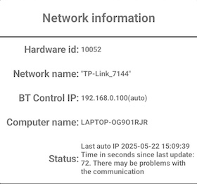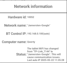 It will in most cases be clear from the STATUS in the network information why there is no communication. The tablet has switched to another network than the one used at the start in the example shown below.