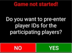 Start button appears The green START button appears when contact with the control software has been established. That does not mean that you can start playing. If the Wifi icon is grey and it says “Registration possible”, you can register the start positions. The button will lead to the Game not started message shown to the right if the game has not been started. Pre-entered IDs will appear in the mid section of the screen. If the IDs are correct, you should await the WiFi icon to become green before clicking the START button. (Otherwise you will have to pre-register anew.) You can change your player ID entry when the game has been started, were you to change start position in the last minute.