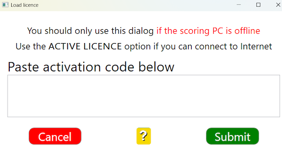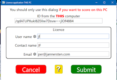 First you will have to select BUY LICENCE on the scoring computer. Byt bild Copy the scoring computer’s ID (starting /qdAT... in the example). Then paste the ID into the licence application for OTHER PC. BYT BILD Click Submit, reconfirm that the application is for another PC, and you should get an email with the licence code. Copy the code and bring it to the scoring computer. On the scoring computer you select LOAD LICENCE